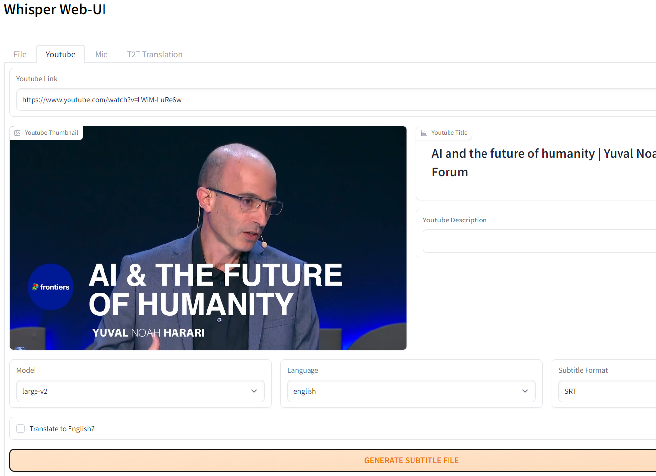 [Whisper-WebUI] ์๋ ์๋ง ์์ฑ ๋ฐ ์ถ์ถ & ๋ฒ์ญ๊น์ง ํ๋ฒ์