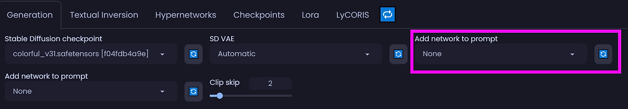 3. ์๋์ฒ๋ผ Add network to prompt๋ฅผ none์ผ๋ก ํ๊ณ ์ฌ์์ํ๋ ์ฌ๋ผ์ก๋ค.