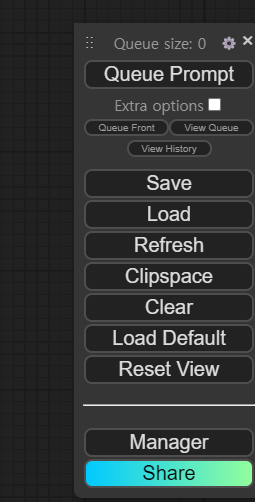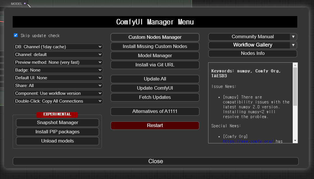 - ์ค์นํ ComfyUI๋ฅผ ์ฌ์์ํ๋ค. ์๋์ ๊ฐ์ด Managerํญ์ด ์ถ๊ฐ๋๋ค.