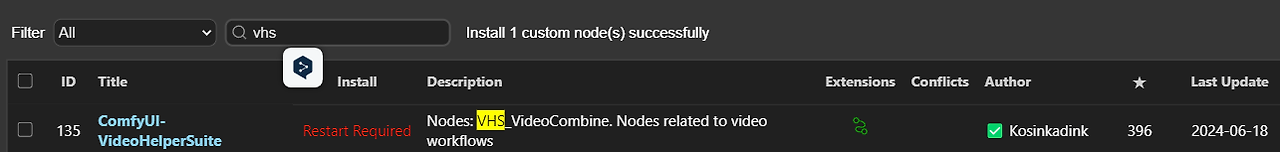 - ๊ทธ๋ฆฌ๊ณ vhs๋ฅผ ๊ฒ์ํ์ฌ ๋์จ ComfyUI-VideoHelperSuite๋ฅผ install ํ๋ค