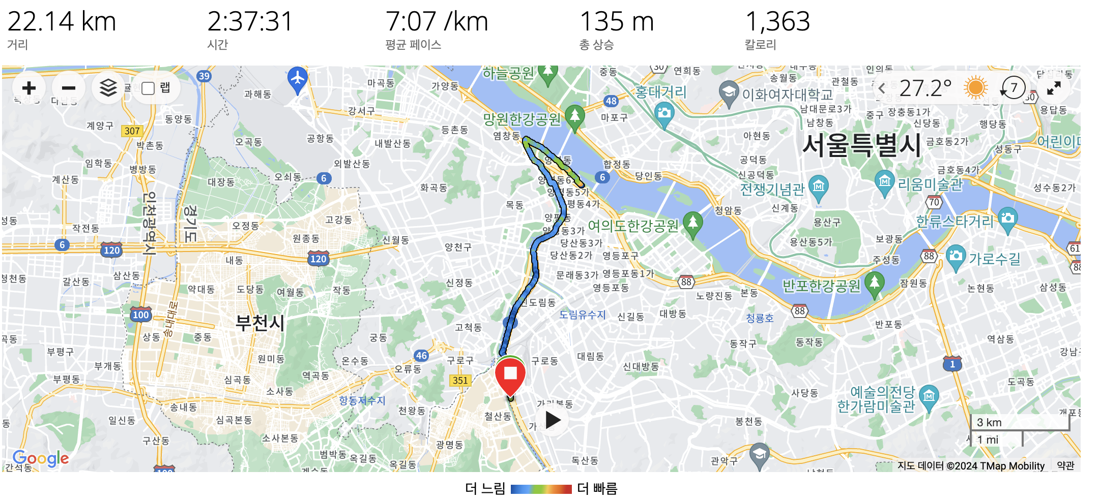 1. ๋ด๊ฒ๋ ์ถฉ๊ฒฉ์ ์ธ ๊ฒฐ๊ณผ๋ค. ์ฒ์์ผ๋ก 15km์์ ๋ฐ๋ฐ๋ฅ์ด ์ํ์ง ์์๋ค. ๋ฐ๋ฐ๋ฅ์ด ์ํ์จ๊ฑด 19km์ฆ์์ด์๊ณ ์ด๋๋ ์ํ๊ธดํ์ง๋ง ๊ฑท๊ฑฐ๋ ์ฌ์ง์๊ณ ๊ณ์ ๋ฌ๋ฆด์๋ ์๋ ์์ค์ด์๋ค.