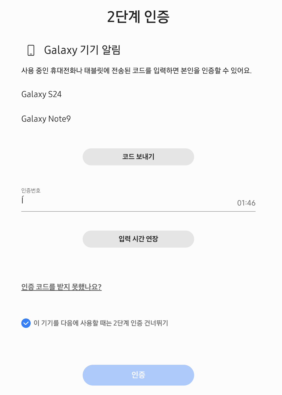 30๋ถ ํ ๋ค์ ์๋ํ๋ ์ด๋ฉ์ผ ์ธ์ฆ์ด ์ถ๊ฐ๋์๊ณ ์ค๋ ์ด๋ ๋ง์์ ์ด๋ฉ์ผ ์ธ์ฆ์ ํ๋๋ ์ ํ๋ฉด์ด ๋ ๋ฌ๋ค. ๊ทธ๋๋ง ๋ฌ๋ผ์ง๊ฑฐ๋ผ๋ฉด Galaxy Note9์ด ์ถ๊ฐ ํ์๋๋ค๋ ๊ฑฐ์ง๋ง ์ ๊ฑด ์ด๋๊ฐ๋์ง๋ ๋ชจ๋ฅด๋ ํฐ์ด๋ผ ์๋ฌด ์๋ฏธ๊ฐ ์์๋ค.